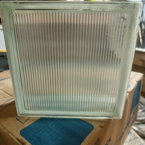 Kirkas, ruudullinen lasitiili (n. 19 x 19 x 8 cm), ostajan itse purettavaksi. Silikonisaumat. Sijainti siistin toimistokiinteistön hissiauloissa. Lasitiiltä vapautuu myyntiin toimistokiinteistön saneerauksen yhteydessä. Määrä tarkentuu saneeraussuunnitelman edetessä.