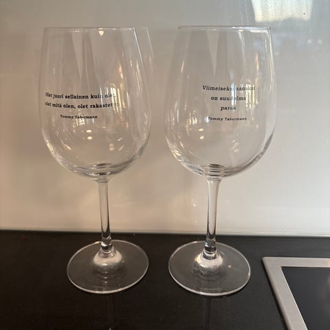 Viinilasi tekstillä (Tommy Tabermann)