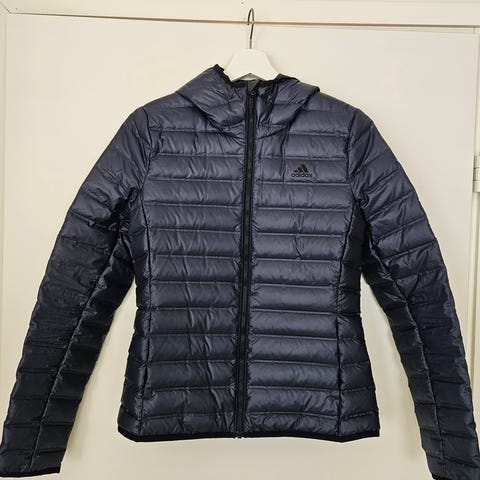 Siistikuntoinen Adidaksen kevyttoppatakki. Pesulappu leikattu pois.