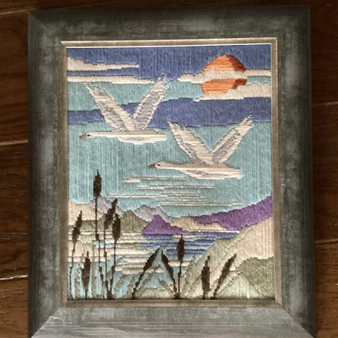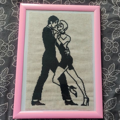 21 x 26 cm pitkä ristipisto kirjonta taulu "Aamupala". Käsityö.