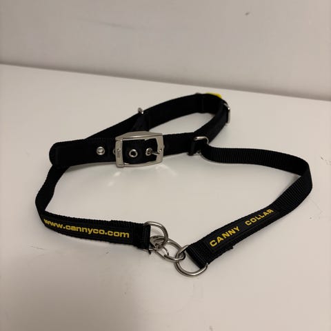 Canny collar vedonestopanta tukemaan hihnakäytöksen opettamista. Kaulanympärys 33-38cm. Ei nouse silmille. Lenkin kuonon päältä voi ottaa pois osaksi lenkkiä. Kulunut (katso kaksi viimeistä kuvaa), mutta ei mitään käyttöä haittaavaa.
