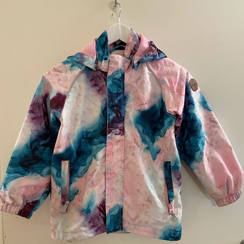 Siisti ja ehjä. Kertaalleen pesty. Fleece etu ja takaosassa, ei hihoissa. Pitää hyvin vettä ja tuulta