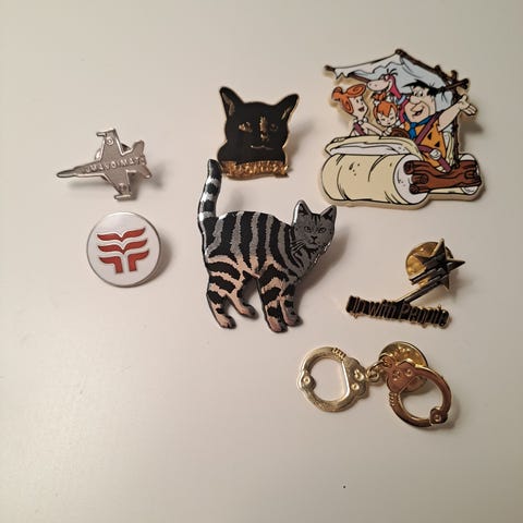 Kissan mallinen pinssi, takana piikki. Toisessa kuvassa sytkäri havainnollistamassa kokoa.