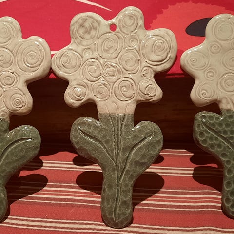 Kristiina Pulkki käsintehty keraaminen kukkakoriste saviruukussa. Koristeessa on useita kukkia ja lehtiä, väriltään punaisia kukkia ja vihreitä lehtiä.