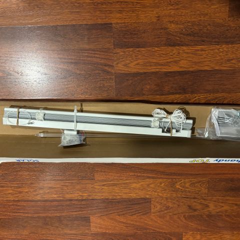 120cm leveä ja 155cm korkea. Kaikki osat ja asennusohjeet alkuperäispakkauksessa. Puinen rimotus ja ylämekanismin eteen tulee puurima peittämään metallin. Helppo asentaa seinään tai kattoon.