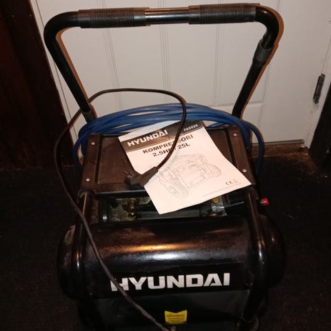Hyundai HY2000 kompressori, jossa 24 litran säiliö. Väri musta. Sopii erilaisiin paineilmatöihin ja kotikäyttöön. 3 vuotta vanha, säilytetty lämpimässä piha varastossa. Käy ja kukkuu erinomaisesti. Kaupan päälle letkut ja tilpehöörit kuten renkaantäyttö väline ja ilmapistooli.
