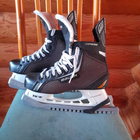 Toronto jääkiekkoluistimet koko 43 ja Bauer kypärä. Luistimet ovat mustavalkoiset ja kypärä valkoinen. Varusteet soveltuvat jääkiekkoon.