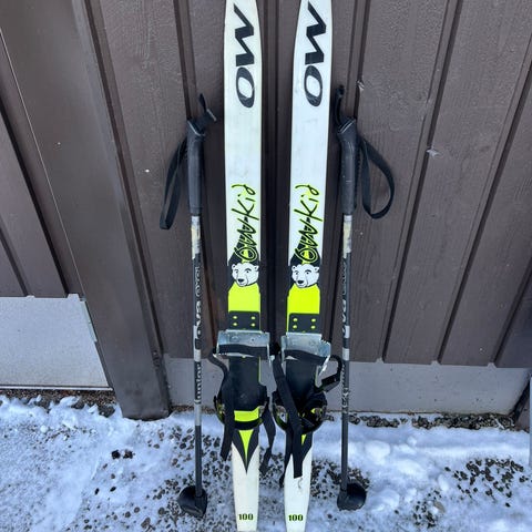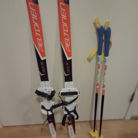 Uudenveroiset Peltonen Sonic lasten ensisukset 100 cm ja sauvat 70 cm. Sukset voiteluvapaalla pitopohjalla. Sukset kiinnitetään kenkiin.