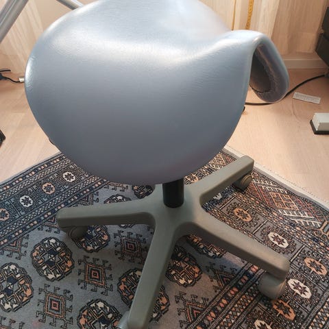 Ergonominen, ferrarinpunainen Salli Twin -satulatuoli kaksiosaisella istuimella ja mediumjousella. Tuolissa on monipuoliset säädöt, kuten istuimen kallistus ja korkeuden säätö, jotka parantavat työasentoa. Tukeva metalliristikko pyörillä, valmistettu Suomessa.