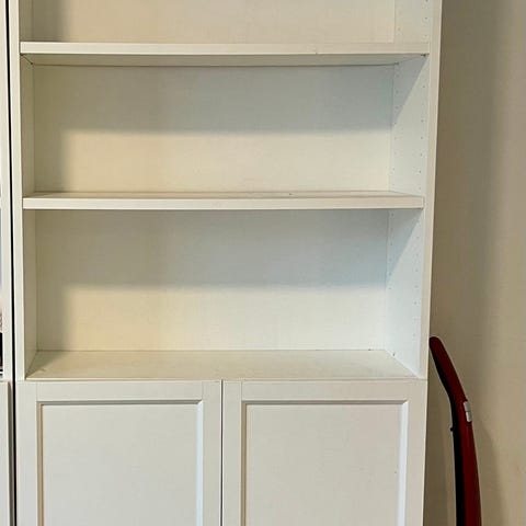 Ikea Billy kapea kirjahylly korotusosalla ja matalalla ovella. Muutamia käytön jälkiä, katso kuvat! Yleisilme siisti.