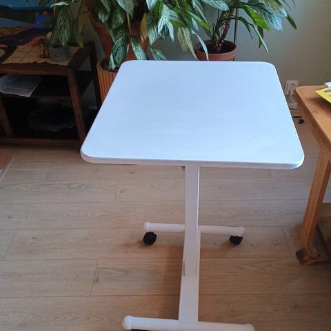 Hyväkuntoinen Selka korkeussäädettävä pöytä kaasujousella. Pöytää saa helposti liikuteltua rullien avulla, rullat saa myös lukittua.