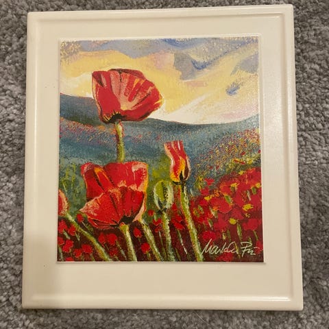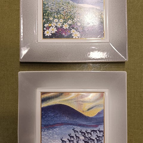 Punaharmaat Kermansaven seinätaulut. Toinen lintuaiheinen ja toinen mökkiaiheinen. Molemmat ovat todella siistit. Leveys 19,3 cm ja korkeus 20,8 cm.