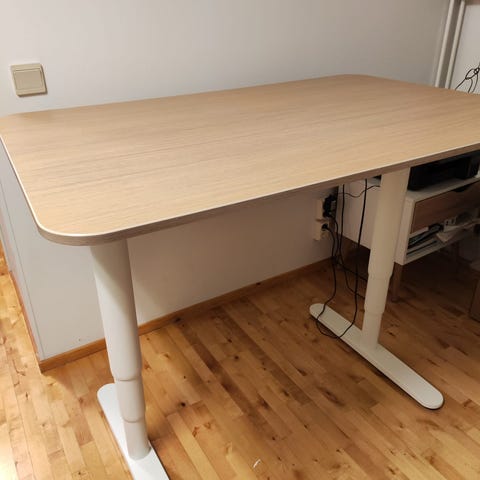 Hyväkuntoinen sähkötoiminen kulmatyöpöytä. Todella tukeva (raskas). Ainoastaan pieni jälki kannessa.
