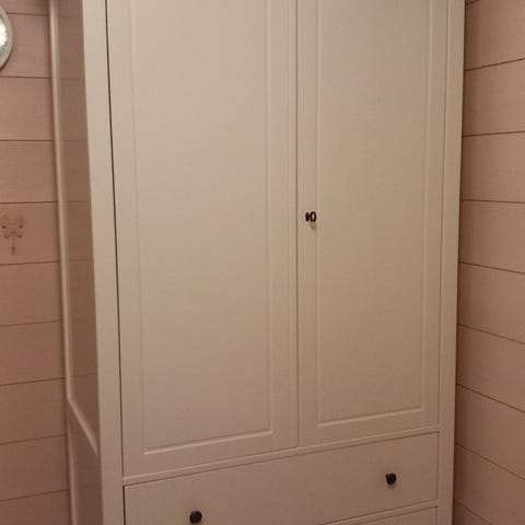 Hyväkuntoinen Ikean Hemnes-sarjan kaksiovinen liukuovikaappi vaaterekillä ja kahdella lokerolla.