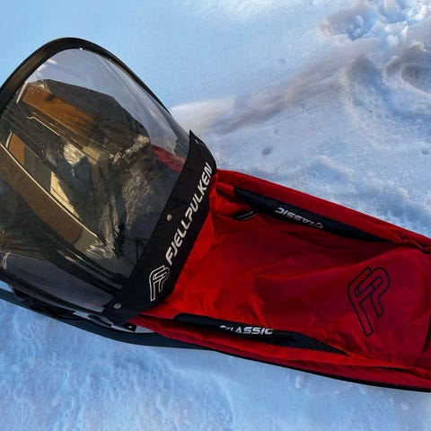 Myydään lasten kuljettamiseen tarkoitettu Fjellpulken ahkio ja tarvittavat varusteet (=lämpöeristetty matto, suojapeite, tuulilasi, selkänoja, kaatumissuojat, vetoaisat ja -valjaat, kuljetuspussin ja lämpimän makuupussin).