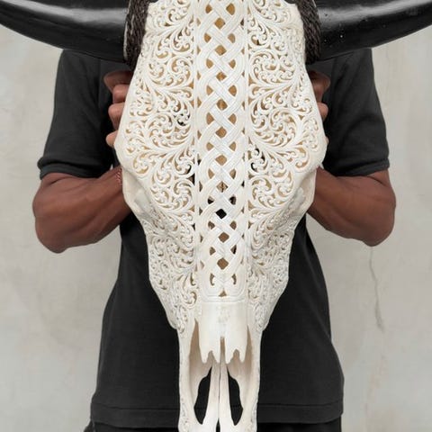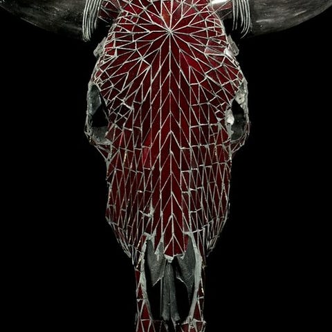 Suuri härän pääkallo, joka on peitetty lasimosaiikilla. Kallo on täysin käsin koristeltu suurella huolella. Se on epätavallinen, koristeellinen kappale.