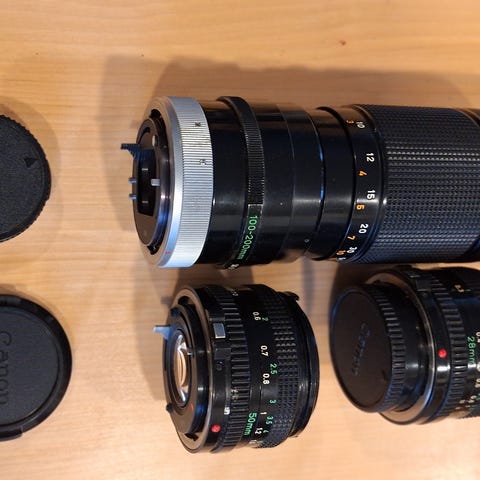 Hyvä- ja täysin kuvauskuntoinen, japanilainen vintage-kamera Canon AT-1 ja siihen sopivat objektit sekä muuta kuvista ilmenevää oheistuotetta. Ainut "kauneusvirhe" on kuvassa esitetty kumisen varjostimen pieni halkeama, joka ei kuvaustulokseen vaikuta. Muutoin tuotteet ovat ehjiä, siistejä ja käyttökuntoisia.