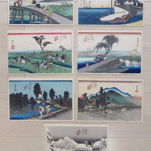 Set of 7 pieces of vintage woodblock prints, from the Hiroshige Tokaido Series -