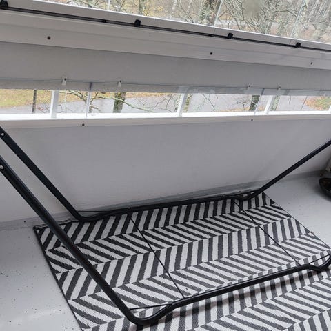 ja telineeseen kuuluva värikäs riippumatto (väri on haalistunut jonkun verran käytössä, muuten kunto on hyvä).