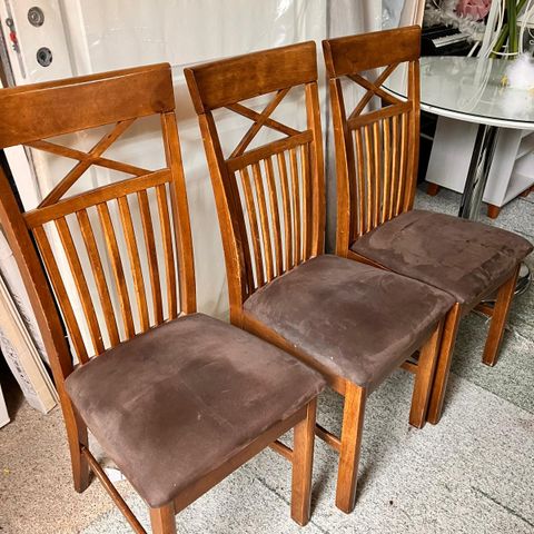4 kpl ruokapöydän tuolia. Muu ten hyvässä kunnossa, mutta osasta jaloista puuttuu jalkatulpat.