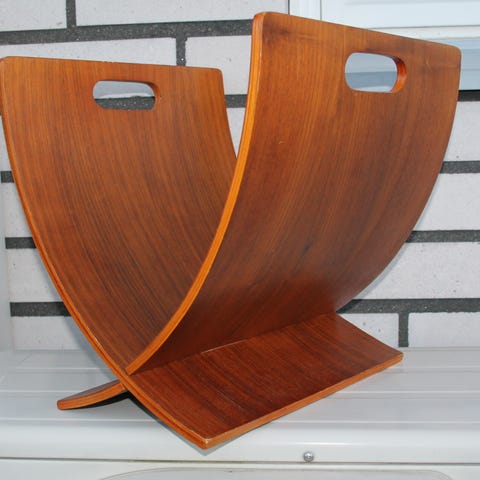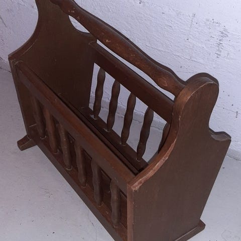 Tämä seinälle asennettava sanomalehti- ja aikakauslehtiteline on valmistettu massiivipuusta, erittäin todennäköisesti tammesta, ja siinä on lämmin, tummaksi petsattu viimeistely, joka korostaa selkeää syykuviota kauniisti. Organisesti muotoiltu takalevy on koristeltu leikatulla, reliefeinä olevalla kukkamaalauksella, joka on tyypillistä myöhäiselle Art Nouveau -kaudelle, ja siinä on vaatimaton, lähes arkkitehtoninen siirtymä varhaisen Art Deco -tyylin muotoihin. Etupuolella on kaksi toiminnallista metallista koukkua, jotka on tehty luultavasti kromatusta tai nikkelöidystä teräksestä, ja jotka toimivat sekä käytännöllisinä että esteettisinä osina suunnittelussa. Käsityötaidolla tehdyn puutyön ja teollisen näköisen metallin yhdistelmä heijastaa 1900-luvun alun sisustussuunnittelun siirtymäkauden tyyliä. Koko on suunniteltu seinäkiinnitystä varten ja alun perin tarkoitettu sanomalehtien ja aikakauslehtien järjestelmälliseen esittelyyn ja säilytykseen asuin- tai toimistoympäristössä.
