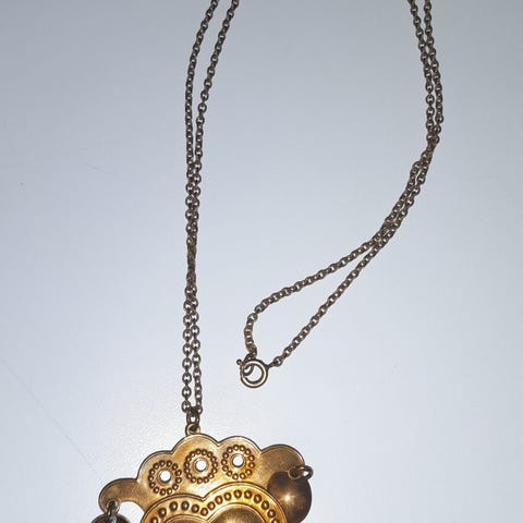 Muhkean kokoinen, näyttävä pronssinen kaulakoru / riipus. Siistikuntoinen. Ketjun pituus noin 2×40 cm. Sydänkorun halkaisija noin 5 cm.