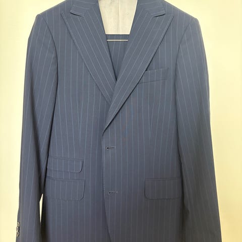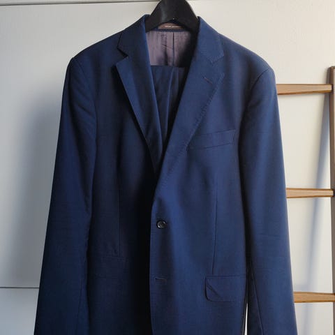 Klassinen tummansininen bleiseri, 100% villaa. Koko 46, kuvissa näkyy virallinen kokotaulukko.