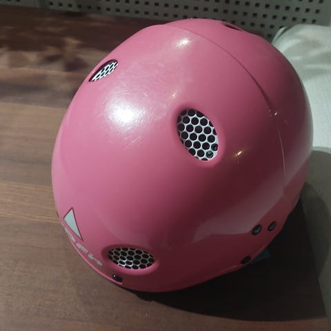 Kypärä luisteluun pienelle lapselle. Sopiva noin 1-2 -vuotiaalle tai isommalle mikäli on pieni pää. Joitain naarmuja löytyy.