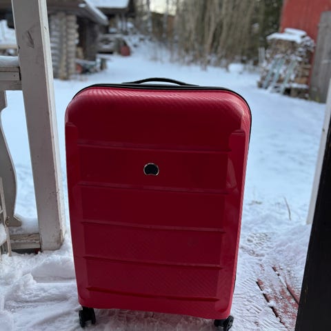 Muutamasti käytössä ollut vaaleansininen/mintun värinen matkalaukku. Täysin kunnossa, joitain ulkoisia käytönmerkkejä.