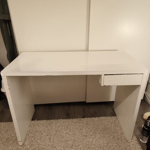Annetaan kirjoituspöytä, pöytä on käyttökelpoinen, mutta siinä on kuluman jälkiä ja yksi jalka hieman rikki. Nouto Kalevasta.