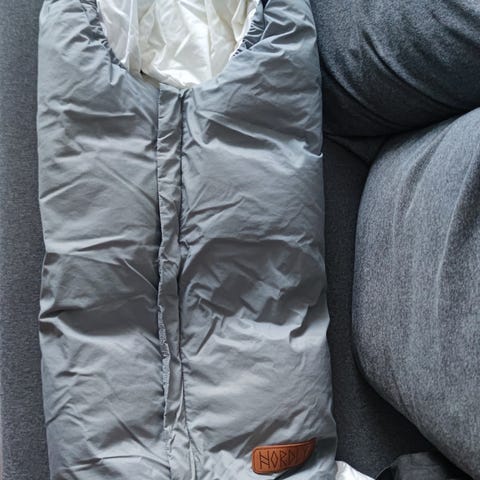Nordlys Freja untuvatäytteinen lämpöpussi rattaisiin. Jatkopala, menee pitkään. Pesty ja rummutettu ohjeen mukaisesti käytön jälkeen. Sisävuoreen jäi pieni tahra, näkyy kuvassa.