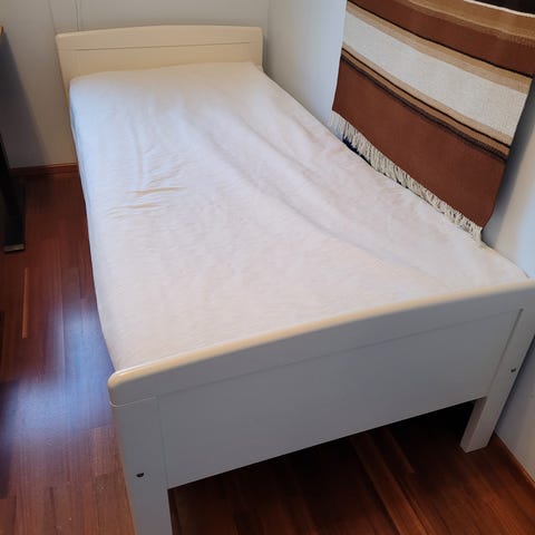 90 cm valkoinen koivusänky, 10 cm vaahtomuovi patja ja Hilding petauspatja