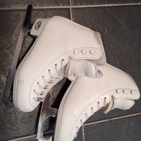 Riedell Topaz skates in good condition, bought used, and used for one season in skating school. Have been sharpened then but for the new skater will require new sharpening. Have got standart signs of wear and tear for the good skates that are still in their prime.