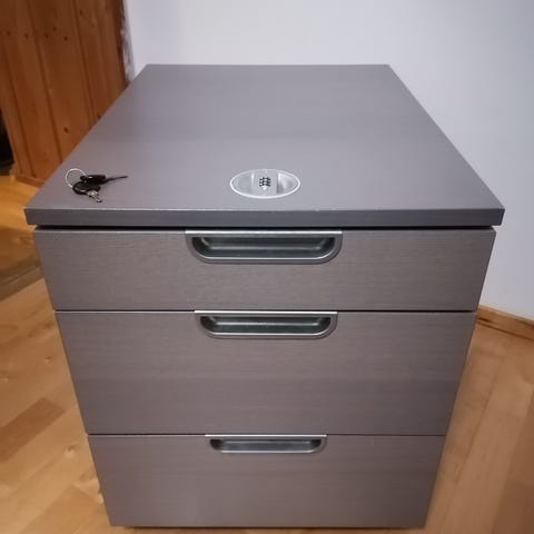 Neljällä vetolaatikolla. Laminoitu graniitin harmaalla. Leveys 40cm, syvyys 47cm ja korkeus 58cm (ilman pyöriä 52cm). Ylälaatikoon on avain.