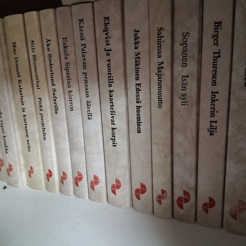 Kansissa haalistumaa,yhden kirjan sivussa jälkeä,katso kuvat.Muuten luettavassa kunnossa.