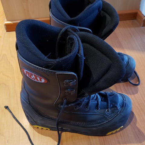 Hyväkuntoiset lumilautakengät seuraavalle käyttäjälle. Irrotettava sisäkenkä, ns. perinteinen nauhakiristys. Toisen kengän kärjessä pieni pintavaurio (kuva).