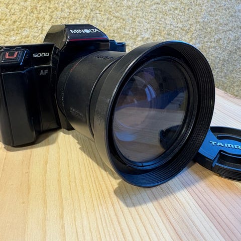Filmikameran ystävälle tai opetteluun kunnollinen, Minoltalla huollettu järjestelmäkamera varusteineen.