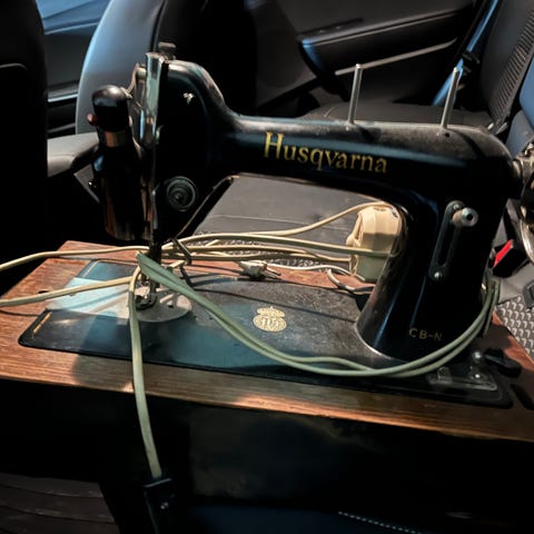 Hakusanat: retro, käsityö, kone, vihreä, ompelukone, ompelu, kantolaukku, husqvarna, ompelukoneet, käsityöt, Paketoitava, Valmistaja, 1960-luku, jalkapoljin