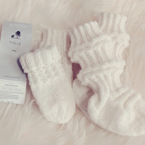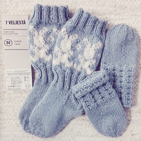 Lämpimät vaaleansiniset sukat ja tumput, pohjan pituus 11 cm, kämmenen pituus 7,5 cm.