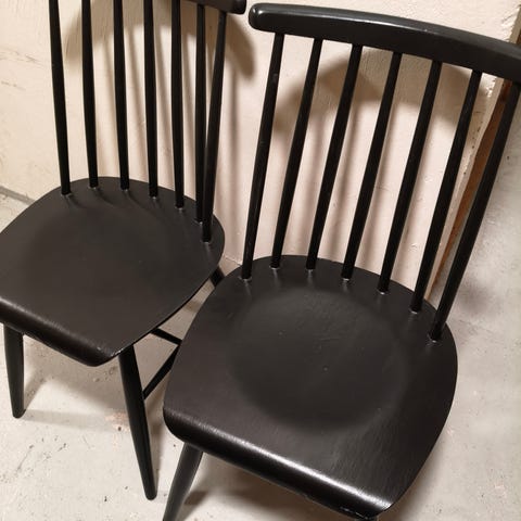Neljä samanlaista puista pinnatuolia, todella jämäkkäät ja laadukkaat tuolit, pinnassa näkyy jo hieman lakan halkeama istuinosassa, sopii siksi täydellisesti uudelleenmaalattaviksi tai sellaiseenaan. Yhden istuinosas alettu hiomamaan mutta projekti jätetty kesken.