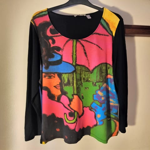 Naisten lantiopituinen trikoopaita/ tunika. Hihojen pituus kyynärpäihin. Musta/kirjava. Kunto hyvä ja koko M/L. Made on U.K.