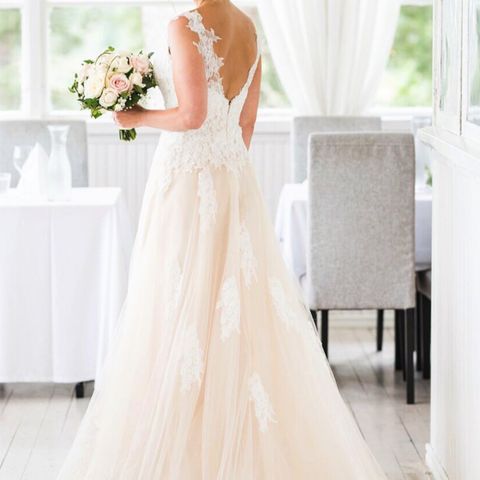 Käytetty yksissä häissä, jonka jälkeen käytetty pesulassa pestävänä. Ostettu Seinäjoelta Bohola- liikkeestä uutena. Olkaimia ja helmaa lyhennetty. Pukua käyttänyt on 160cm pitkä.