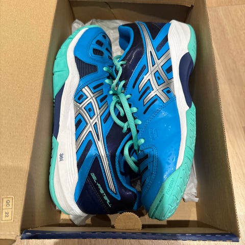 Asics Gel-Blade 7 naisille, koko 36. Värit sininen, valkoinen ja keltainen. sopii sisäpalloilulajeihin kuten salibandy, sulkapallo ja padel. Ovh 140€