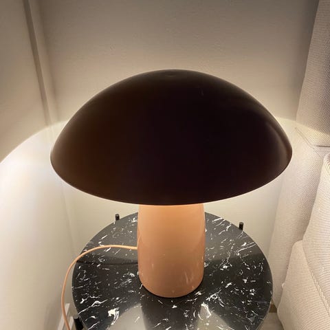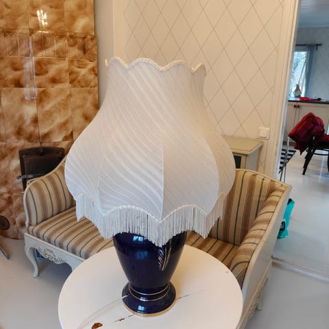 Valaisimessa ei ole näkyviä vaurioita ja se on toimiva. Hieman kenossa jalustassaan.