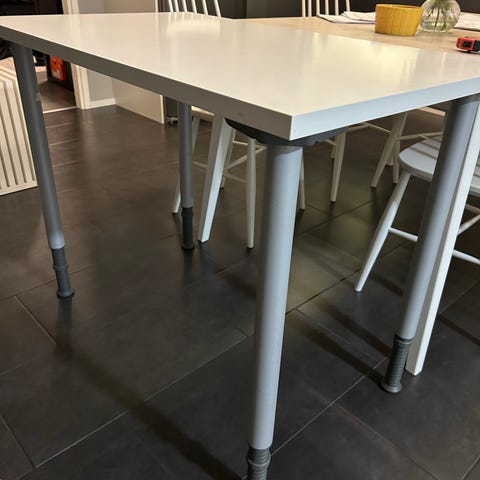 Kallax-hyllyssä ruuvinjälkiä useammissa paikoissa, kuten kuvista näkyy. Ruuvattu alhaalta päin pöytälevyyn kiinni. Pöytälevy ja jalat irrotettavissa kuljetuksen ajaksi. Voidaan purkaa ostajaa varten.