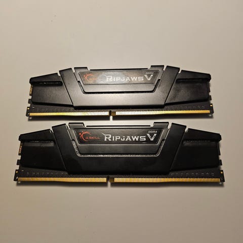 G.Skill Ripjaws V DDR4 -muistimoduulit, yhteensä 16GB. Pakkaus sisältää kaksi muistimoduulia, jotka on suunniteltu tarjoamaan DDR4-suorituskykyä. Sopii tietokoneisiin, joissa on DDR4-muistipaikat.