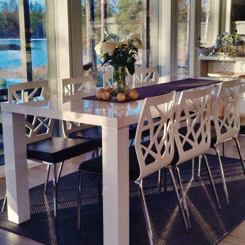 Myydään hyväkuntoinen neljän hengen ruokaryhmä (pöytä ja neljä tuolia). Pöydän pinnassa pari pientä naarmua, näkyy kuvassa kun suurentaa. Tuolit ehjät.