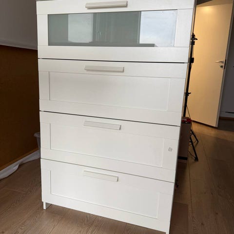 Tyylikäs Ikea Brusali lipasto, jossa on neljä vetolaatikkoa ja avohylly. Valkoinen väri antaa sille raikkaan ja ajattoman ilmeen, joka sopii monenlaiseen sisustukseen.