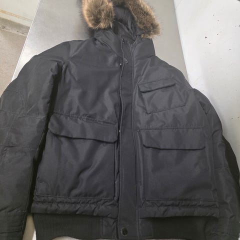 Musta keltaisella twistillä tehostettu toppatakki. Kaikin puolin ehjä ja siistikuntoinen. Irrotettava huppu. Ks muut ominaisuudet kuvista/ kuvateksteistä. Koko