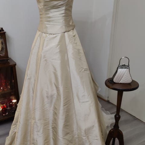 Beige iltapuku myytävänä. Juhlittu vuosijuhlissa kerran. Kooltaan hoikalle ja 180 cm pitkälle matalien korkojen kera. Takana vetoketju.
